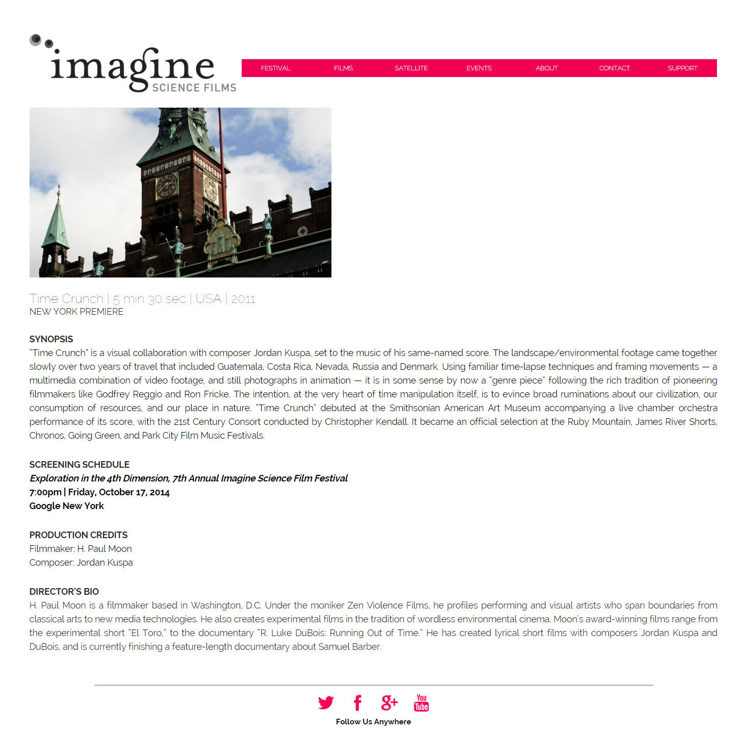 "Time Crunch" is a visual collaboration with composer Jordan Kuspa, set to the music of his same-named score. The landscape/environmental footage came together slowly over two years of travel that included Guatemala, Costa Rica, Nevada, Missouri, Russia and Denmark. Using familiar time-lapse techniques and framing movements — a multimedia combination of video footage, and still photographs in animation — it is in some sense by now a "genre piece" following the rich tradition of pioneering filmmakers like Godfrey Reggio and Ron Fricke. The intention, at the very heart of time manipulation itself, is to evince broad ruminations about our civilization, our consumption of resources, and our place in nature. "Time Crunch" debuted at the Smithsonian American Art Museum accompanying a live chamber orchestra performance of its score, with the 21st Century Consort conducted by Christopher Kendall. It became an official selection at the Ruby Mountain, James River Shorts, Chronos, Park City Film Music and Imagine Science Film Festivals. It subsequently returned to live synchronized screening with a performance by the Dallas Chamber Symphony on April 19, 2016 as a finalist in their Sight of Sound International Film Competition.